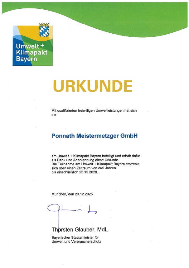 Seit Dezember 2025 ist die PONNATH family group Teilnehmer im Umwelt- und Klimapakt Bayern - eine wichtige Auszeichnung für das Engagement unseres Unternehmens im Bereich Nachhaltigkeit. Mit dem Umwelt- und Klimapakt arbeiten die Bayerische Staatsregierung und ihre Partner, die Vereinigung der Bayerischen Wirtschaft e.V. (vbw), der Bayerische Industrie- und Handelskammertag (BIHK) sowie der Bayerische Handwerkstag (BHT) daran, Lösungen bei Umwelt- und Nachhaltigkeitsthemen zu entwickeln, um Umwelt- und Klimaschutz in Unternehmen und Betrieben voranzubringen. Voraussetzung für die Teilnahme ist, dass neben den gesetzlichen Umweltanforderungen auch zusätzliche freiwillige Umweltmaßnahmen im Betrieb umgesetzt werden.